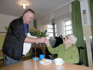 Unser Hausmeister Michael Hahn als Blumenkavalier: Zum Frauentag überreichte er